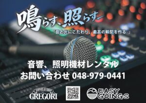 実は、機材レンタル、外現場オペレートの仕事もやってるんです。バンド、ダンス、学園祭、野外Fes、町のお祭り etc…